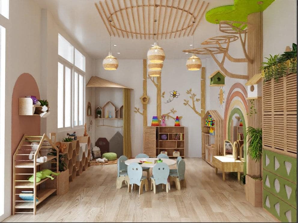Không gian tươi mát với tổng diện tích sử dụng lên đến hơn 1000m2, ánh sáng và không khí tự nhiên giúp các con tận hưởng không khí trong lành của những buổi sớm mai.